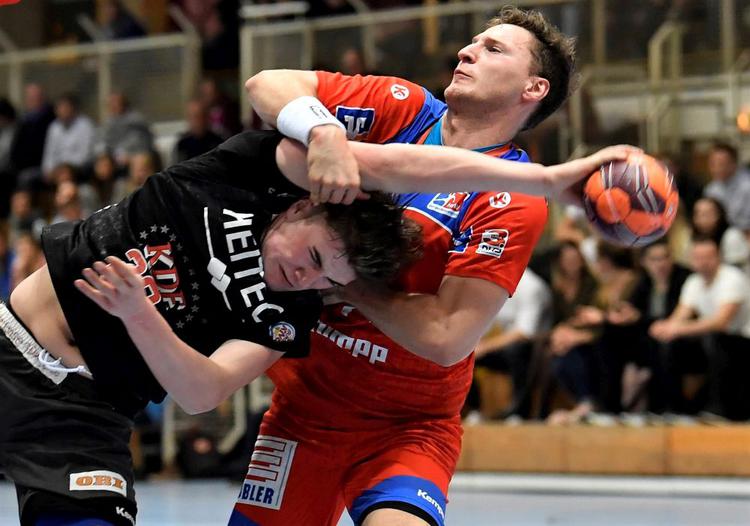 Yannik Bialowas (links), hier noch im Trikot des HC Erlangen II gegen Tobias Heinzelmann von Balingen-Weilstetten II, wechselt nach Rimpar. Foto: Imago Images / Zink